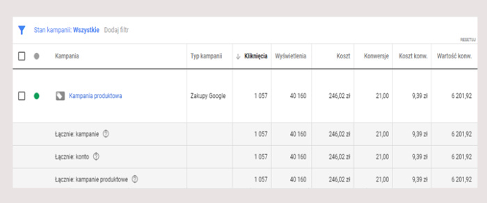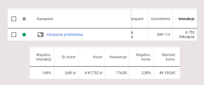 W dalszej kolejności została uruchomiona kampania produktowa. Następnie w ciągu kilku miesięcy eliminowaliśmy produkty, które nie generowały sprzedaży, a zwiększaliśmy stawki na te które zwiększały przychód na sklepie internetowym. Wyniki? Klient po kilku miesiącach współpracy z nami po inwestuje miesięcznie co najmniej 900 zł osiągając przychód na poziomie 17 000 zł . Koszt sprzedaży nie przekracza zatem 8 %.